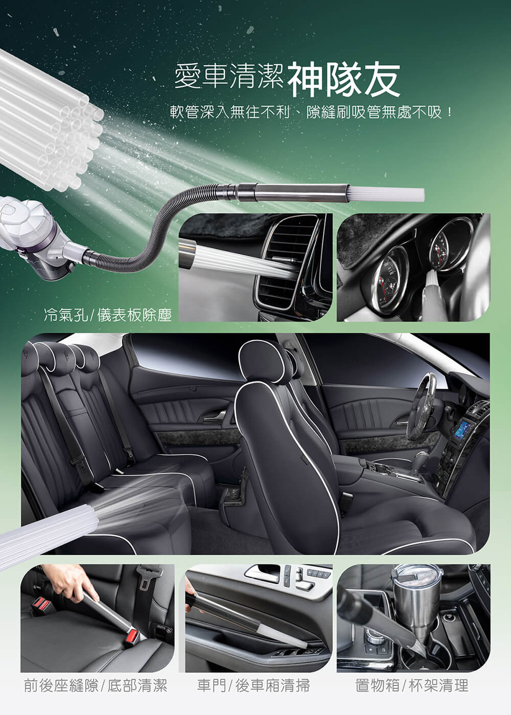包裝內容物:主機x1、兩節式伸縮管x1、集塵桶x1、地板吸嘴x1、二合一扁頭吸嘴x1、背帶x1、收納袋x1、說明書x1