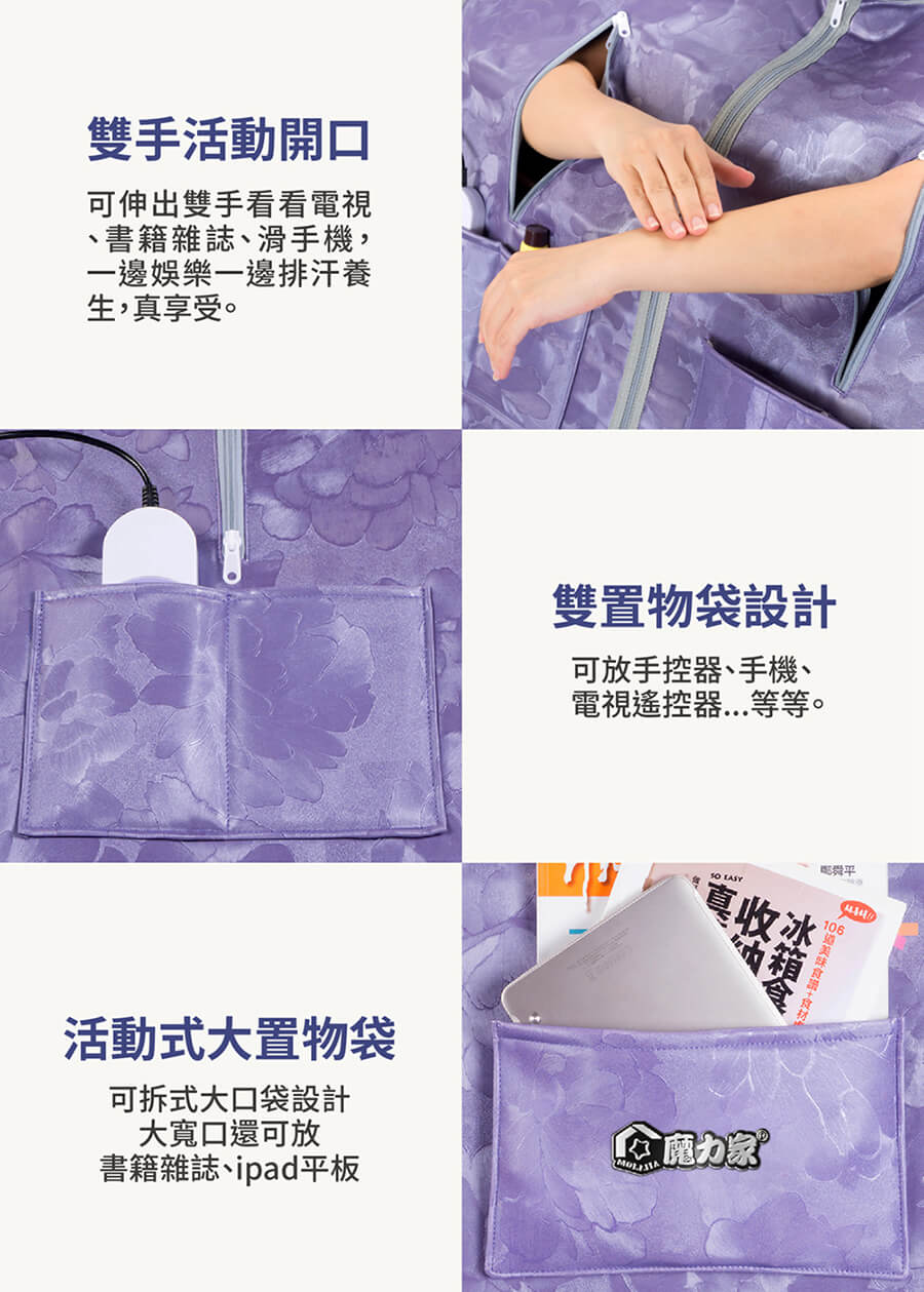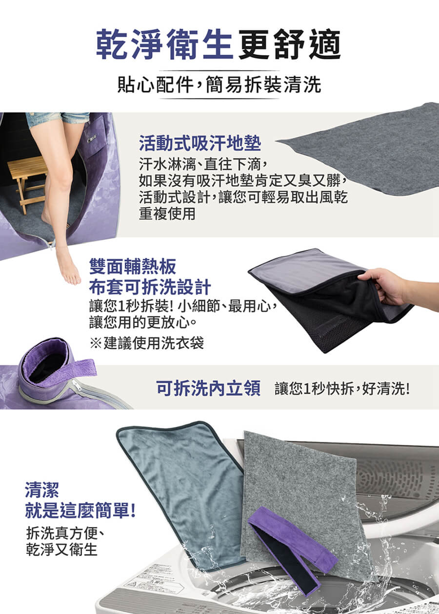 包裝內容物:桑拿屋主商品x1 可拆式立領x1+可拆式大置物口袋x1+可拆式短毛絨墊x1+雙面輔熱板x1+木製支撐桿x1+防水手提收納袋x1 +吸水地墊x1+說明書(含保卡)x1