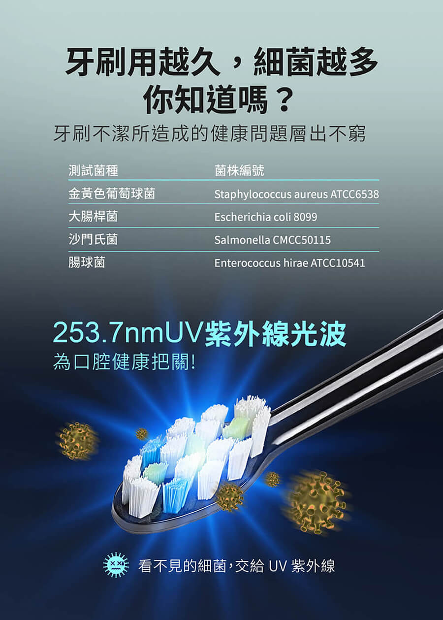 包裝內容物:主機x1+刷頭x2+抑菌充電盒x1+USB感應充電座x1+Mini-B-USB充電線x1+說明書保卡x1