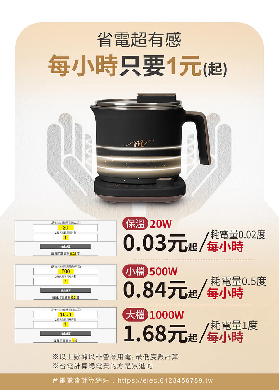 額定功率:1000W (大火/1000W、小火/500W、保溫/20W)